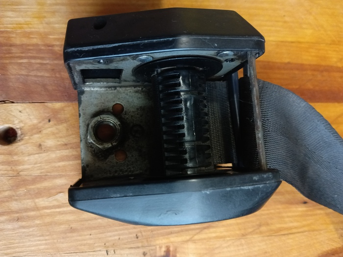 Фиксируем катушку и вытаскиваем штифт. Ремень отрезаем