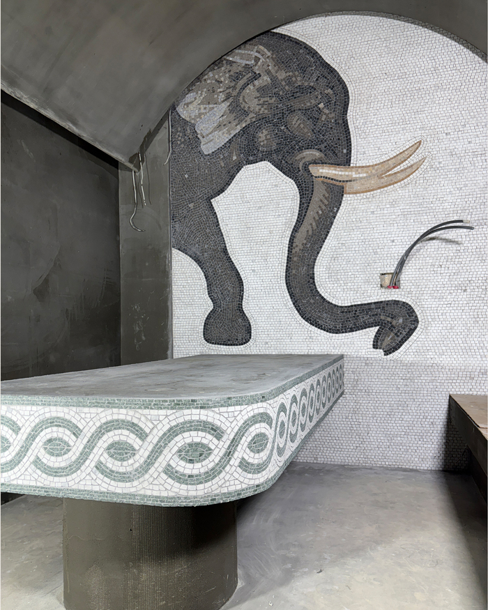 Заключительным этапом стало подбор и нанесение затирочного состава в швы. Затирка подбиралась по цвету мрамора, чтобы не нарушать целостность рисунка. После этого мозаика была тщательно промыта — до полного удаления остатков раствора и достижения чистоты поверхности. Именно в этот момент работа приобрела завершённый вид: гладкая, ровная, с мягким блеском камня, она засияла в пространстве будущего хаммама, обретя своё окончательное место.