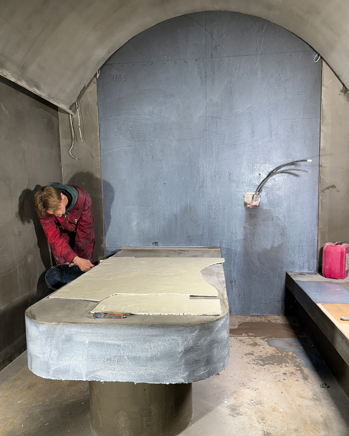 Работа началась с разметки стены и панно. Этот этап требовал особой точности: важно было правильно определить положение композиции, совместить оси и центры, чтобы мозаика легла строго в соответствии с архитектурой помещения. После разметки производилась подрезка мозаики по месту — некоторые участки требовали точной подгонки по форме стен и сопряжению с будущей мраморной облицовкой.