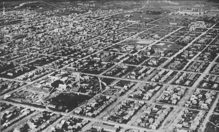 Тойохара с высоты птичьего полёта«Самолёт пересёк самый узкий перешеек острова и пошёл над восточным побережьем на юг, — вспоминает Крюков. — Часто встречались посёлки, тянулась узкой лентой железная дорога, возле неё шоссе. На многих горах выгорел лес. Ландшафт печальный. Поворачиваем от берега в широкую долину. Направо — большие заболоченные поля с речушками, налево — сравнительно крутые горы. Пролетаем над военным аэродромом. Далее у подножия гор, в зелени — красивые здания… Начинается город Тойохара. Делаем над ним круг, чтобы посмотреть сверху. Выглядит он с высоты неплохо. Приземлились на большом аэродроме в южной части города. Двухэтажное каменное здание аэропорта раскрашено в разные цвета. Это камуфляж. Самолёты подруливают на цементированную площадку. Жарко не по-осеннему…»