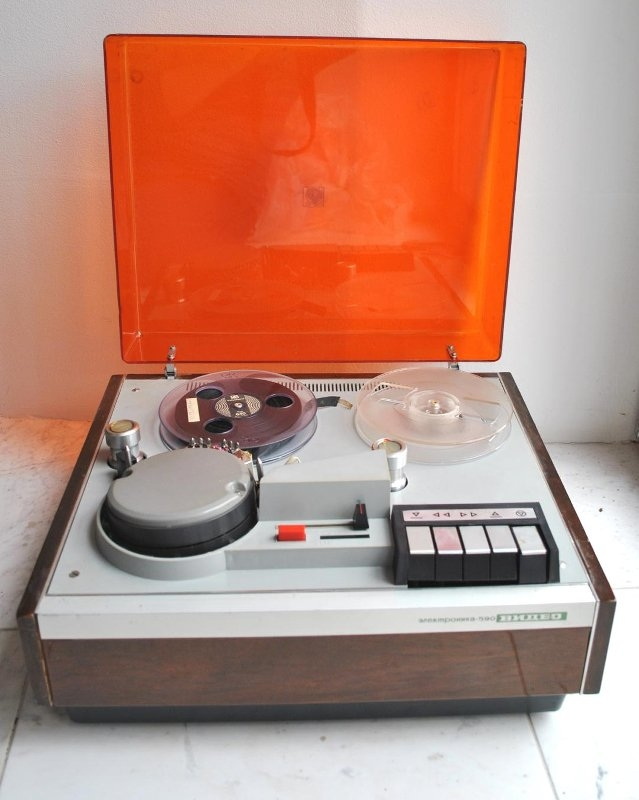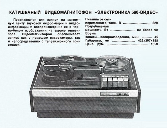 Советский катушечный черно-белый видеомагнитофон "Электроника-590-видео" выпускался Новгородским заводом "Спектр" с 1978 года. Цена видеомагнитофона 1350 рублей.