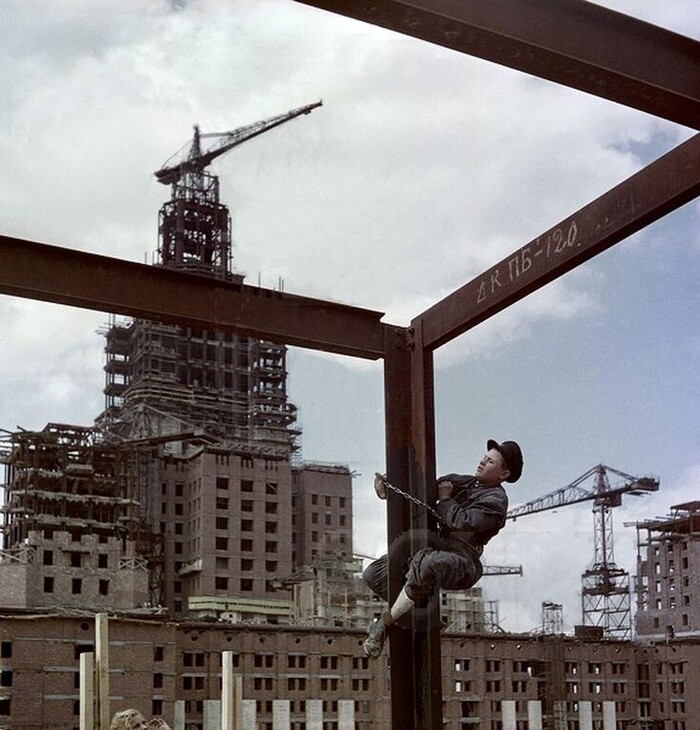 Работа шла и в лютый мороз зимы 1950-1951 гг. Строители работали на внешних стенах с закрытых лесов, которые обогревались паром и электричеством.