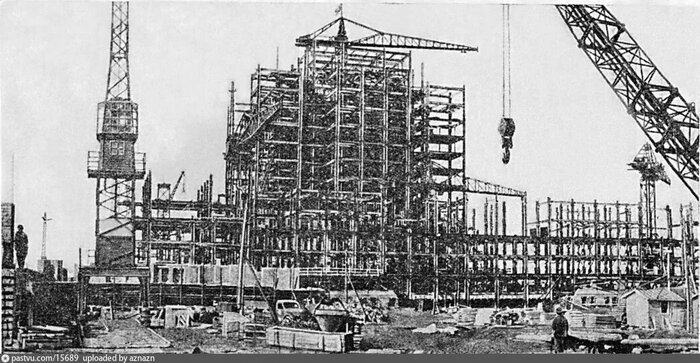 Каркас собирался как конструктор из одинаковых деталей с помощью "ползучих" кранов, устанавливающихся на само здание.