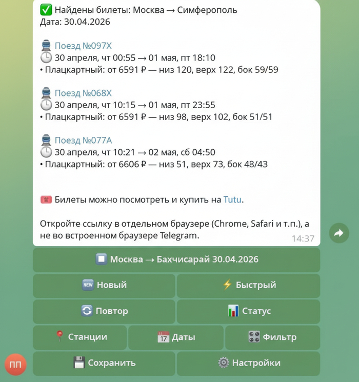 и бот, который молча смотрит на эту карусель билетов и зовёт вас только тогда, когда на горизонте появляется нормальный поезд и вменяемые места.
