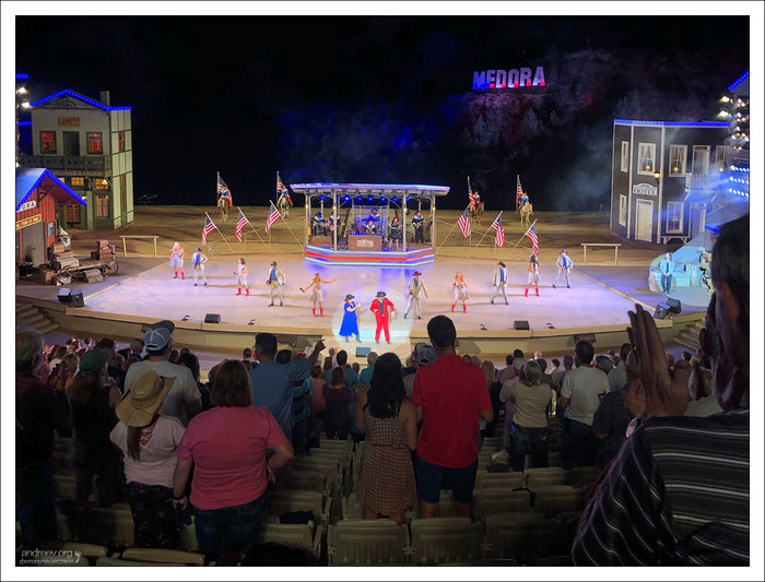 Да, в «деревенской» Дакоте в городке Медора проходит шоу на тему «Дикий Запад». Тем более было приятно, что в нынешние короновирусные времена, где-то еще сохранились островки былого, где можно было наслаждаться хорошей живой музыкой, сильными голосами, и сидеть без масок 🙂 Это, конечно, не уровень лондонских постановок, но и не школьная самодеятельность. Рек.