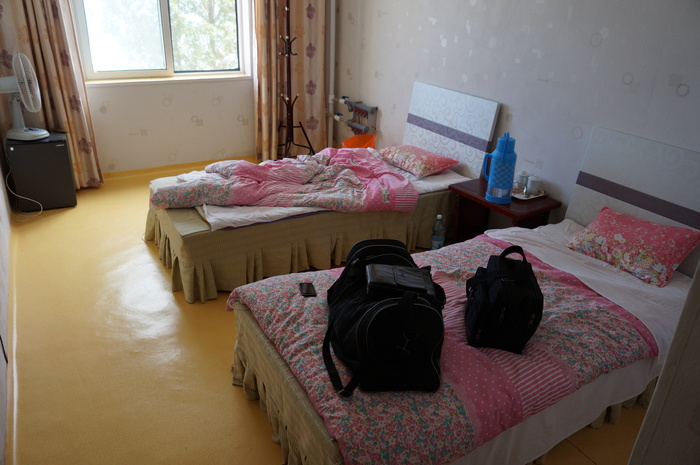 Номера двух- и трёхместные. Внутри чисто и довольно комфортно. В номерах есть телевизоры, по которым сначала крутили какие-то унылые японские (или хер их знает какие) фильмы, потом мы попросили, чтобы нам включили нормальное северокорейское телевидение, и стало гораздо интереснее. Горячая вода была, но не в постоянном режиме, а включали по просьбе. Электричество отключали один раз. Хотя, по наблюдениям, на домах в городе много солнечных батарей - видимо, перебои с электричеством всё-таки не редкость. Наш номер: