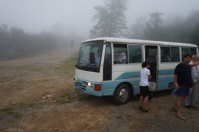 Утром за завтраком познакомились с первым нашим гидом - тем молодым парнем, который не возражал против съёмок. Вообще он оказался своим человеком, прекрасно говорил по-русски, много чего интересного рассказывал и показывал. Первым пунктом нашей программы была гора Сахянсан. Мы поднялись на неё на автобусе, а вниз пошли пешком по горной тропе. По замыслу с вершины горы мы должны были насладиться видом на город и море, но поднявшись и выйдя из автобуса, мы увидели это: