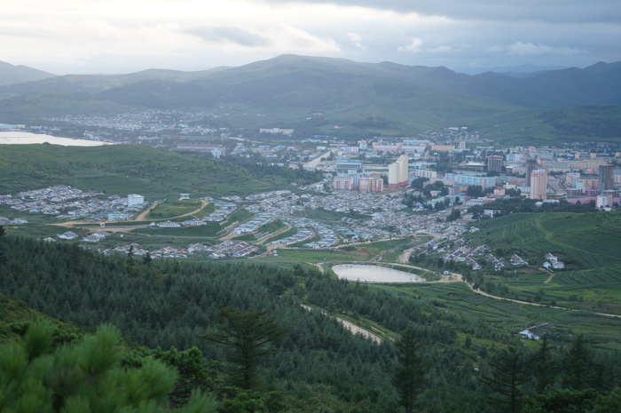 Миновав Сонбон, въехали в Рачжин. В городе дороги, кстати, хорошие, асфальтированные. За городом убитые. Поднявшись на перевал, за которым находилась наша гостиница, мы имели удовольствие посмотреть на город с высоты. Город выглядит вполне аккуратно и симпатично, никакой пресловутой северокорейской разрухи нигде нет.