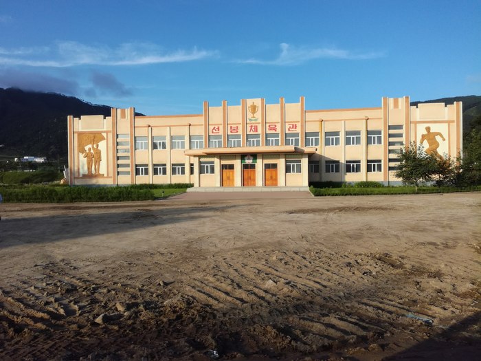 Едем дальше. Въезжаем в город, сначала в район Сонбон. В нём вроде как ничего такого туристического нет, всё сосредоточено в Рачжине, поэтому Сонбон проезжаем без остановки. По дороге фотографирую из окна всё подряд. Вот здание, написано "Сонбонский спортзал" (я немного знаю корейский):