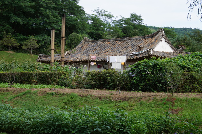 Затарившись корейской продукцией, поехали в посёлок рыбаков. В нём небольшую территорию отвели для прогулок туристов и вылизали её до блеска, положили брусчатку, посадили цветочки, кустики ровно стригут - идиллия. Дальше начинаются улочки с такими же домами, но уже без клумб и брусчатки. Вместе с тем, этот "туристический" пятачок тоже не похож на "потёмкинскую деревню" - дома выглядят обитаемыми, где-то бельё сушится, у всех на маленьких огородах что-то растёт.