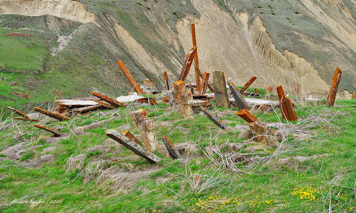 Тонкие прямые камни, похожие на осколки скал, воткнуты в землю вместо надгробий. Мощные заросшие могильные плиты. Выглядит так, как будто тут хоронили много веков назад, но цифры на камнях говорят о том, что здесь захоронения примерно с начала XX века. Видимо, нужно сильно углубляться в религию, традиции и историю Северной Осетии, чтобы понять такое сочетание стилей. Но, я в этом не разбираюсь, так далек от истории Кавказа.