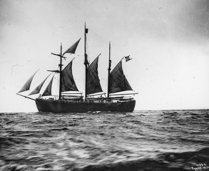 на фото - "Фрам", вмёрзший в лёд. На палубе установлен ветряк.