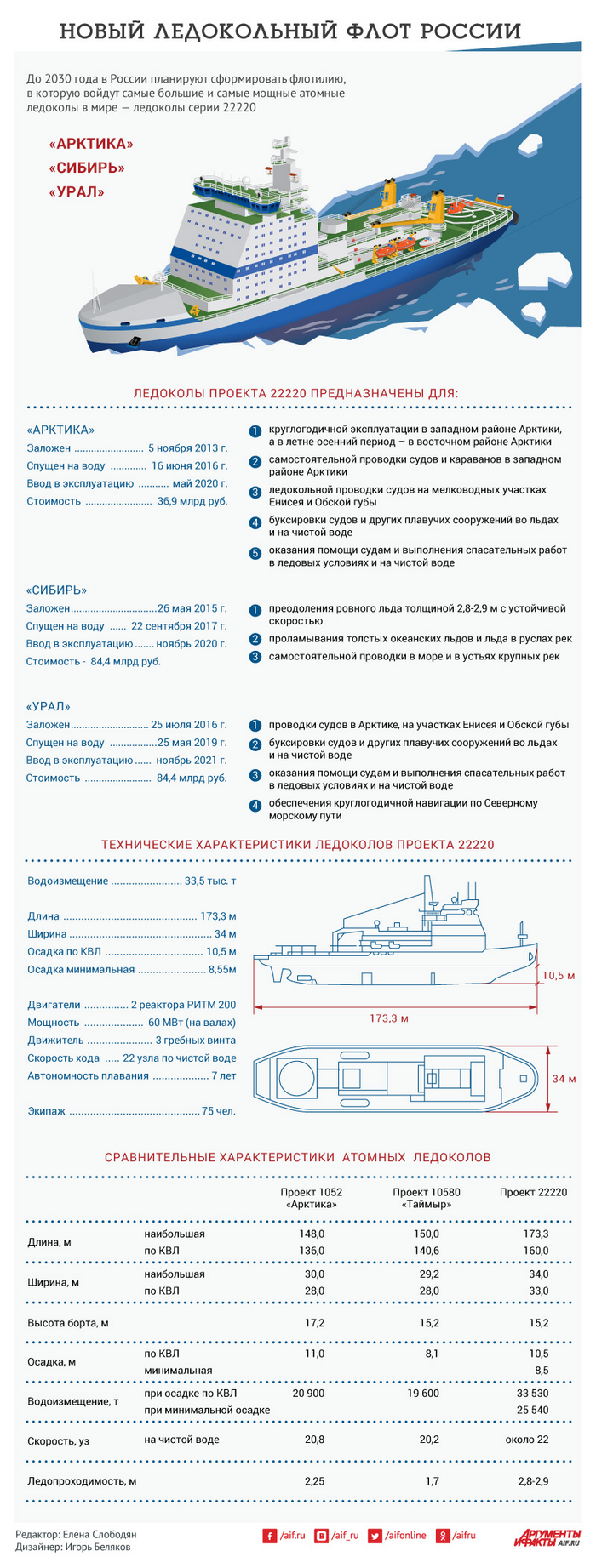 Судно шириной 48 метров спроектировано так, чтобы прокладывать широкие каналы во льдах. Это может способствовать безопасному проходу газовозов и нефтяных танкеров через самые сложные участки Северного морского пути России, особенно в Восточно-Сибирском и Чукотском морях. Планируется что «Россия» будет спущена на воду уже в 2030 году.