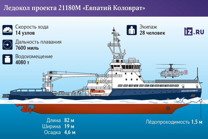 «Евпатий Коловрат» стал вторым кораблем проекта 21180/21180М. Головной — «Илья Муромец» — несет службу на Северном флоте. Он был заложен в 2015 году, в 2017-м передан в состав ВМФ и стал первым за 45 лет ледоколом, построенным для нужд Военно-морского флота. «Коловрат» строился по модернизированному проекту 21180М. В частности, разработчики уменьшили габариты и осадку. Водоизмещение корабля — 4000 т, осадка — 4,6 м против 6,8 м у «Ильи Муромца». По словам разработчика, уменьшенная осадка позволит кораблю заходить в порты Тикси в Якутии и Диксон в Красноярском крае, которые эксплуатируются ВМФ России. А одна из главных задач военных ледоколов — обеспечение базирования и развертывания сил флота в Арктике, в том числе ледовая проводка боевых кораблей и вспомогательных судов.
