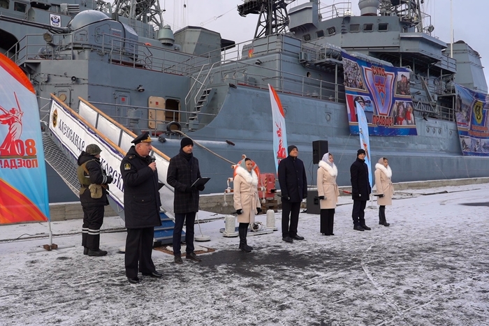 На ледовой арене города Дудинка команда по хоккею с шайбой отряда боевых кораблей приняла участие в благотворительном матче с хоккейной командой «Таймыр». В ходе этого матча было собрано более 100 тысяч рублей, которые будут направлены на нужды таймырских участников специальной военной операции.