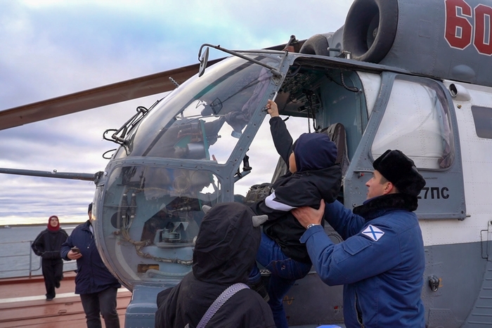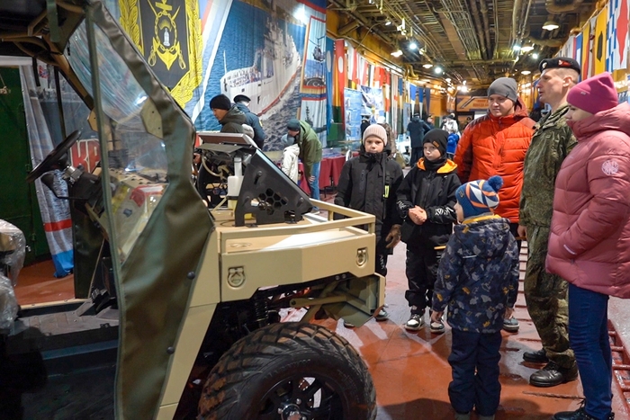 На верхней палубе корабля ребятам показали катера, названные в честь участников первой арктической экспедиции Евгения Федорова, Петра Ширшова и Эрнста Кренкеля, а также патрульный катер, названный в честь Героя России капитана Павла Семенко, участника специальной военной операции.