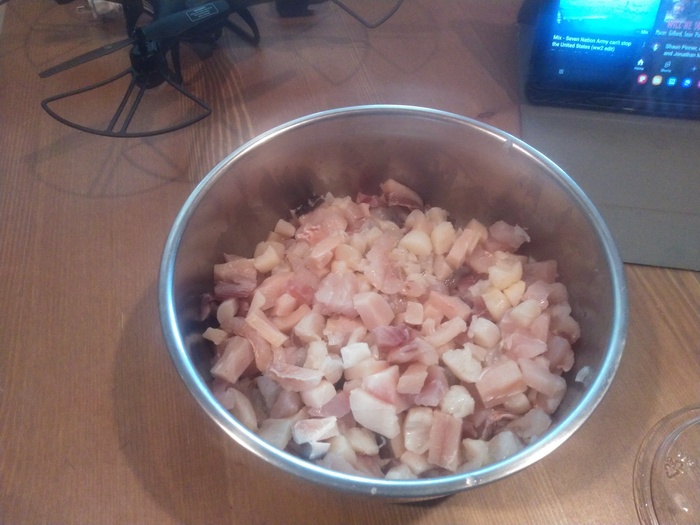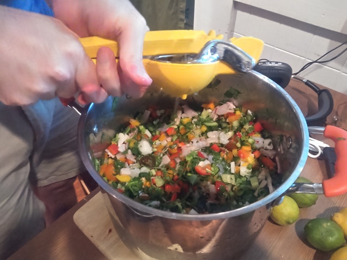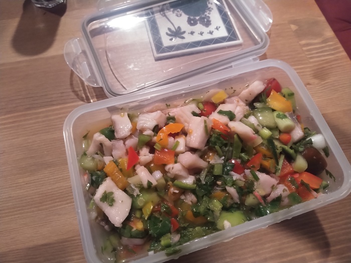 Нарезаем гребешки - не в кашу, а аккуратно, на тонкие ломтики или небольшие кубики. Это же севиче, а не салат "Оливье".