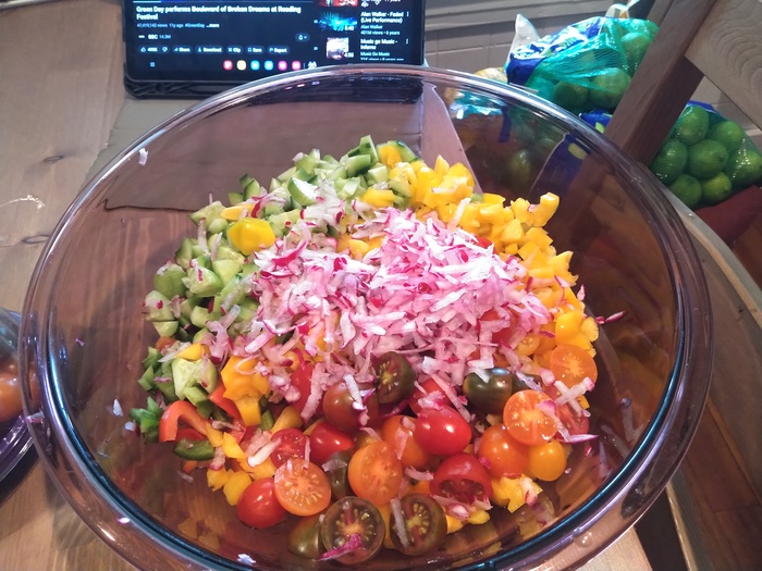 Кидаем туда нарезанный лук, грейпфрут (без кожи!), огурец (мелкий кубик), и мешаем. Да, мешаем с душой.