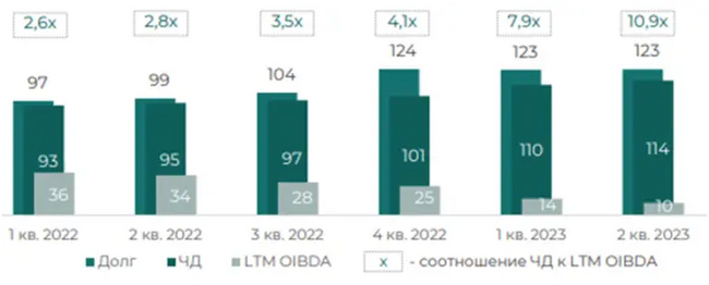 При этом капитальные затраты выросли на 31% (за квартал). Темпы продаж получается восстановить за счёт перестройки каналов продаж. Чистый долг/OIBDA: 10,4х (10,9х на конец второго квартала 2023).
