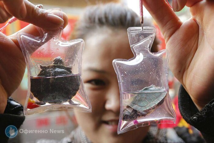 6. В Китае продают брелки для ключей с живыми животными. В запаянном пластиковом пакетике, наполненном жидкостью, обычно находятся бразильские змеиношейные черепахи или мальки макрели. В этой питательной жидкости животные якобы могут прожить до 4 месяцев. Зачастую такие брелки покупают с целью выпустить бедных животных