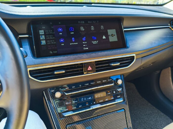 Панель приборов осталась практически неизменной: классические аналоговые шкалы, ромбовидные дефлекторы обдува и отдельно стоящий экран мультимедийной системы с заметными рамками. Однако в серийной версии эти рамки стали более функциональными: слева появился физический регулятор громкости, что добавляет удобства в повседневной эксплуатации. Центральный подлокотник, хоть и откидной, получился довольно узким, а под ним нет привычной ниши для хранения мелочей.
