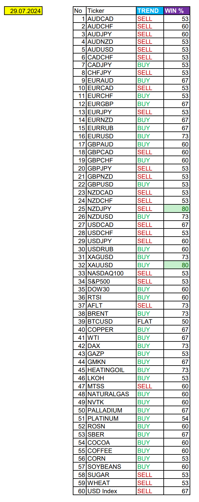 Золото и NZDJPY в фокусе: Сезонные тенденции и вероятности на Понедельник 29.07.2024