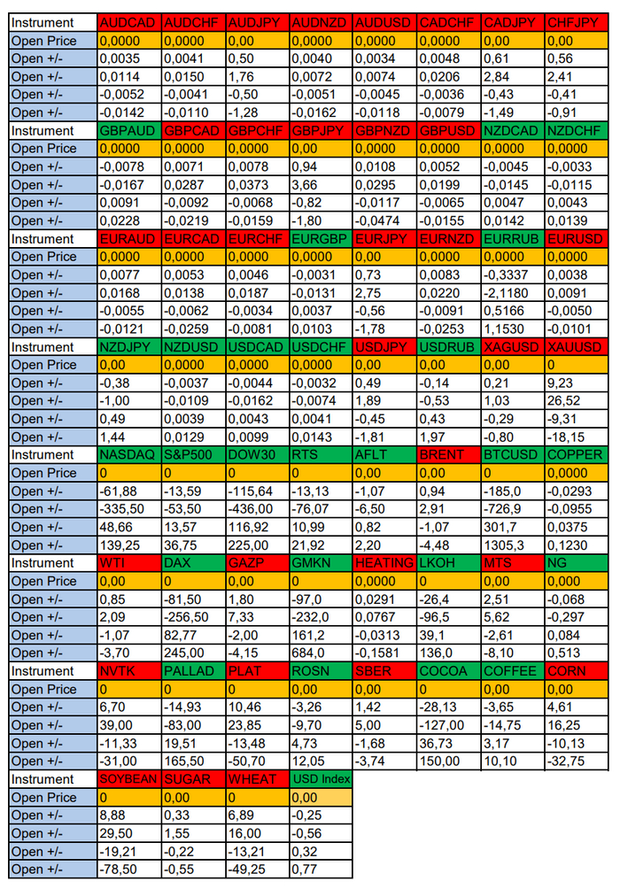 Весь перечень анализируемых активов указан ниже в общем количестве 60 инструментов. Здесь Вы найдете активы рынка Форекс, популярные активы Московской биржи, не менее популярные активы Чикагской биржи СМЕ и мажор криптовалютного сегмента - Биткоин, за которым следуют все альткоины.