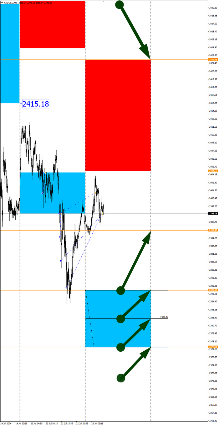 Зона продаж 2409,69-2423,33. Но новые продажи логично искать выше верхней границы зоны продаж с целью 2423,33. Торговый объем в продажах сокращаем раза в 4, так как фон доллара слабый и актив можем утянуть наверх, здесь внимательнее.