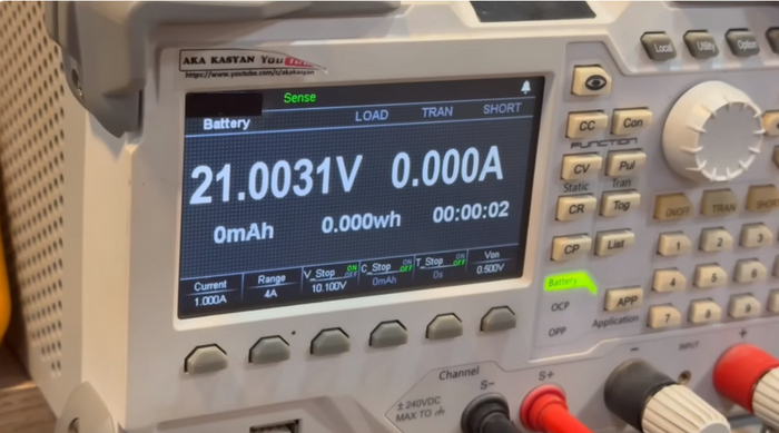 Разряжаем аккумулятор электронной нагрузкой для выявления емкости, ток разряда составляет 1 ампер, аккумулятор полностью сейчас заряжен показывает напряжение 21В.