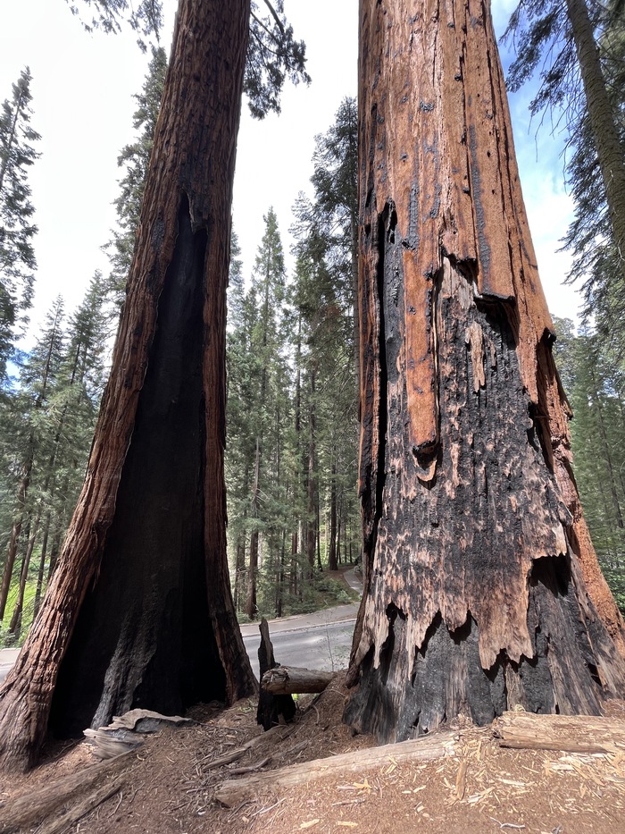 Первым делом встретил горелые секвойи. А потом прочитал на табличке рядом, что пожары для них - важный фактор выживания. Секвойи плохо горят и умеют заращивать ожоги, а вот мелочь вокруг них таким умением обделена, поэтому пожары освобождают гигантам окрестности от конкурентов