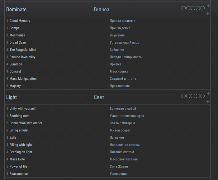 Были разработаны новые силы и переработаны некоторые из дисциплин VTM. По мере развития персонажа данные силы будут проявлять новые, более могущественные силы. Эти способности не направленны исключительно на боевые конфликты, многие из них полезны даже в обыденной жизни.