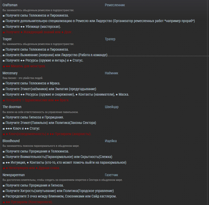 2) Типы охоты заменены на промыслы - занятие, которым обычно Занимается затронутый и получает от него некоторые преимущества, недостатки, специализации, а так же Силы.