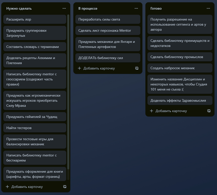 Для удобства я завёл доску на Trello, где веду список проделанной работы.