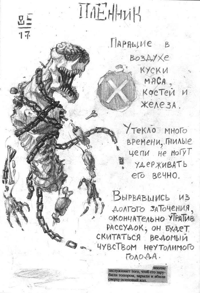 Добежав до небольшого пустыря, Костя увидел, что в паре метров от него, зависла в воздухе какая - то тварь. Это было похоже на трупные останки, обмотанные цепью. Существо из парящих кусков мяса, костей и железа издавало ужасающий рев. Оно кого – то отчаянно пыталось поймать.
