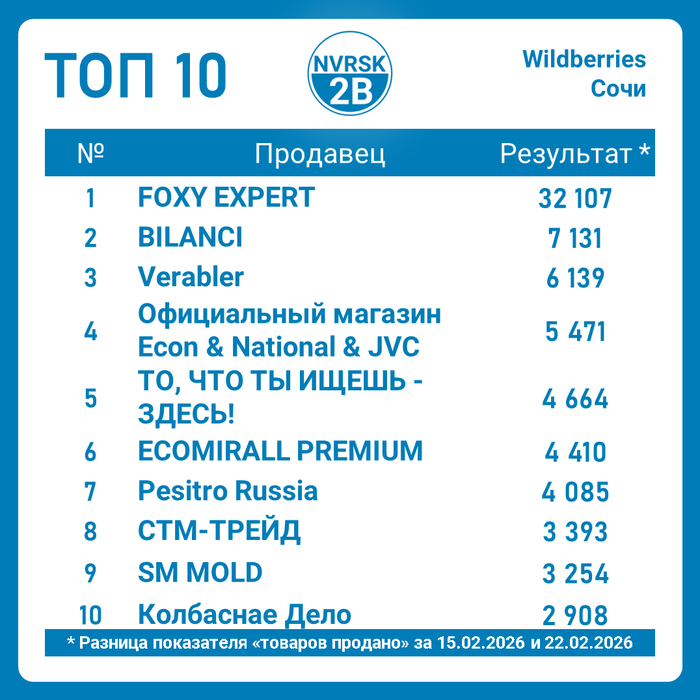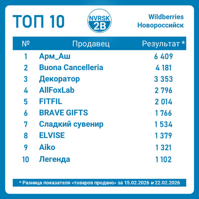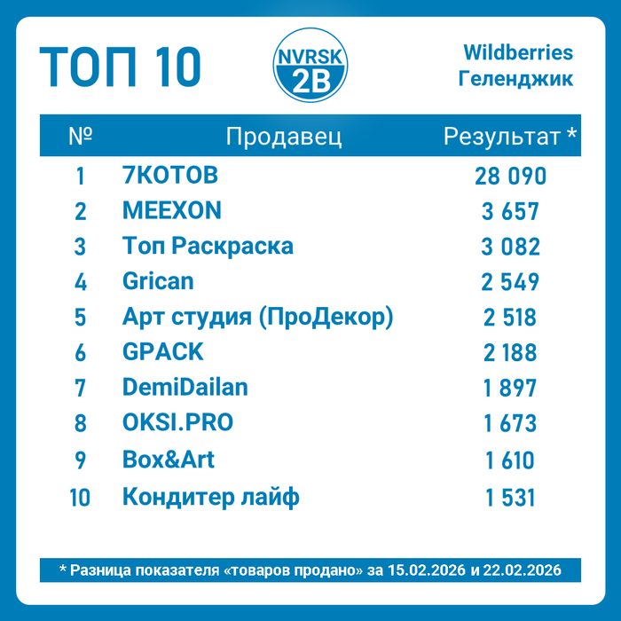 Неделя на кануне праздника выдалась жаркой. Статистика по продажам Новороссийских селлеров на Wildberries за период 15–22 февраля 2026. Данные основаны на разнице показателей «товаров продано» на недельном отрезке.