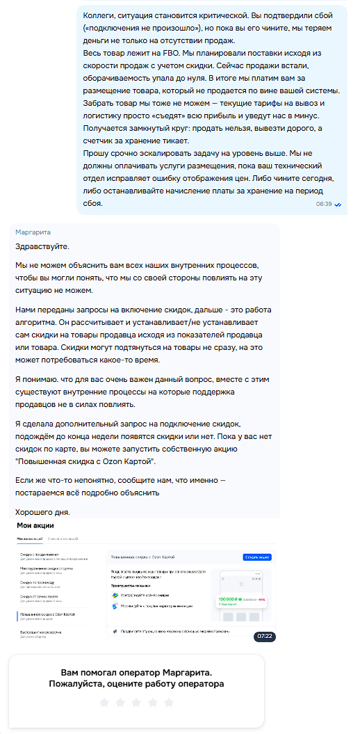 Проходит неделя. Скидки нет. Продажи стоят. Деньги за хранение товара на складе Ozon списывает исправно.