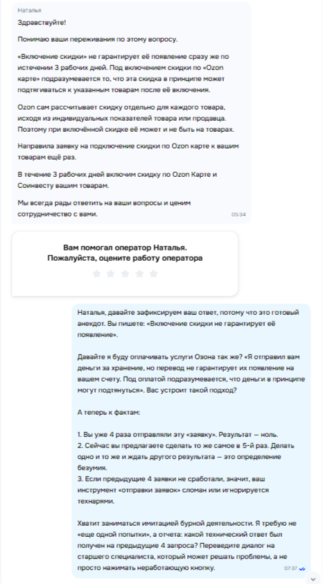 Мой ответ поддержке: «Наталья, давайте я буду оплачивать услуги Озона так же? "Я отправил вам деньги за хранение, но перевод не гарантирует их появление на вашем счету. Под оплатой подразумевается, что деньги в принципе могут подтянуться". Вас устроит такой подход? Вы уже 4 раза отправляли эту "заявку". Результат — ноль. Делать одно и то же и ждать другого результата — это безумие».