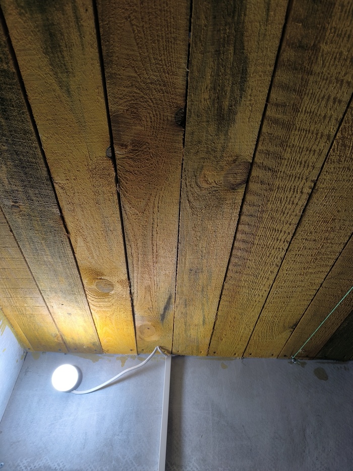 Когда я рассказывала про пристройку для летнего душа, местные специалисты строители дружно вынесли вердикт, что крыша сделана неправильно и едва наступит осень/зима, все покроется конденсатом и рухнет под снегом. Поэтому я особенно пристально наблюдаю за этой частью дома