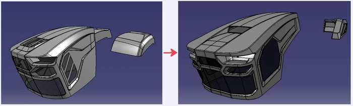 После утверждения концепта началась вторая часть работы, уже не такая эффектная - детальная проработка. Требовалось разработать примерную схему крепления сеток, крепеж самого капота к подъемному механизму. Построить отбортовку, провести обрезку капота и крыльев. Для крыши необходимо было разработать стыковочные отштамповки к кабине, и пр.