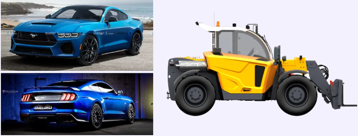 Самое первое что мне пришло на ум - Ford Mustang GT 2024 года, он и стал главным в мудборде, а так же ранее уже спроектированный капот на наш телескопический погрузчик.