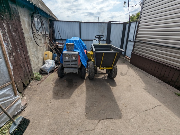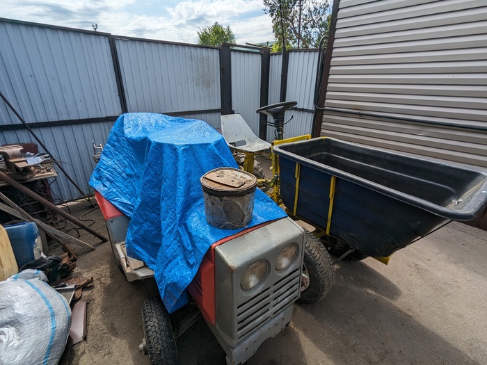 Корыто на 350 литров от антиудара. Опрокидывается корыто само по рычагу без гидравлики и прочих извращений. Мотор на шесть китайских кобыл с избытком. Стартер, все дела. Мокрое центробежное сцепление и редуктор мотоблока с двумя вперёд и одной назад. Регулируемая рулевая стойка из рулевого от классики. Регулируемое сидение по высоте и вылету от руля. Две педали.