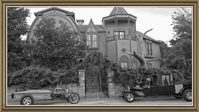 Информация взята отсюда. Напоследок хотелось бы поведать Вам про Особняк Мюнстров, фигурировавший в сериале. На самом деле - это декорация Universal Studious, которая также появлялась и в других американских ситкомах начала 1960-х годов. Название дома -"The Munster Mansion", никогда не использовалось в шоу. Согласно сериалу "Мюнстеры", особняк был построен на остатках старого форта, а дедушка внес первый взнос, когда Герман и Лили купили дом. Восьмиугольная башня третьего этажа с мансардной крышей и четырьмя окнами была переделана в крытую вдовью аллею с шатровой крышей, центральное окно второго этажа было украшено искусственным фронтоном из пряников , а также были добавлены дымоход и кривой флюгер в виде летучей мыши-вампира. Территория была оборудована голыми деревьями, сухими листьями и каменными въездными воротами. После небольшой "черновой обработки" новой, более темной краской, дом и его территория были использованы для всех внешних съемок сериала, а интерьеры были сняты на отдельных звуковых сценах. В какой-то момент предполагалось, что адрес дома будет 43 Mockingbird Lane (Пересмешников переулок, 43), Камелот, Нью-Джерси, но был изменен на 1313 Mockingbird Lane в городе Mockingbird Heights/Высоты Пересмешника (штат неизвестен).
