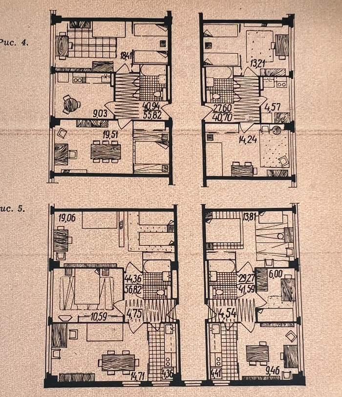 Варианты планировок квартир в домах. Обратите вниание на рисунок 3. Тут внизу слева (вторая по счёту) квартира-студия для одного человека общей площадью 18 м². Из журнала "Строительство и архитектура Москвы" за 1963 год (№12).
