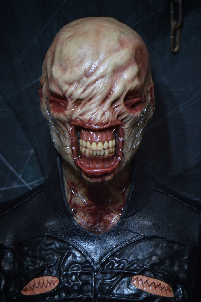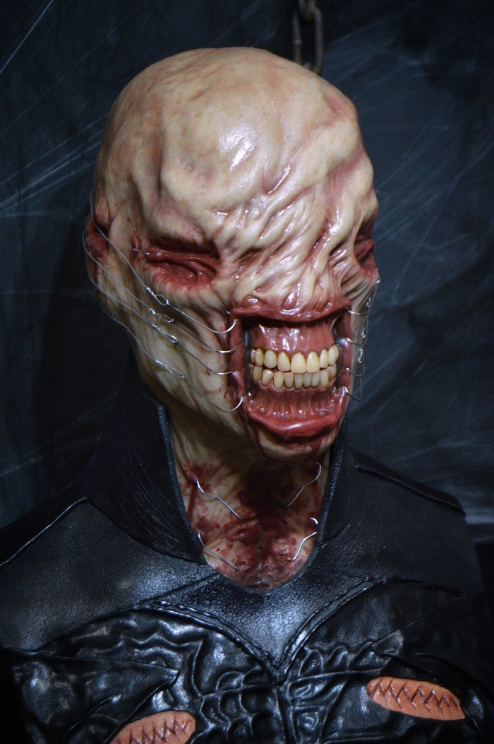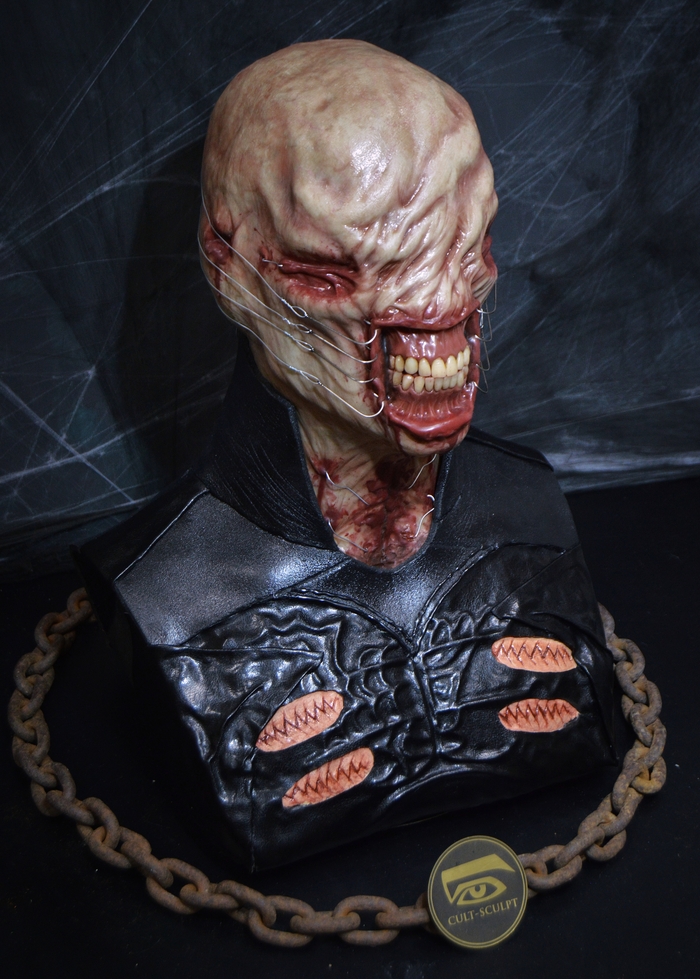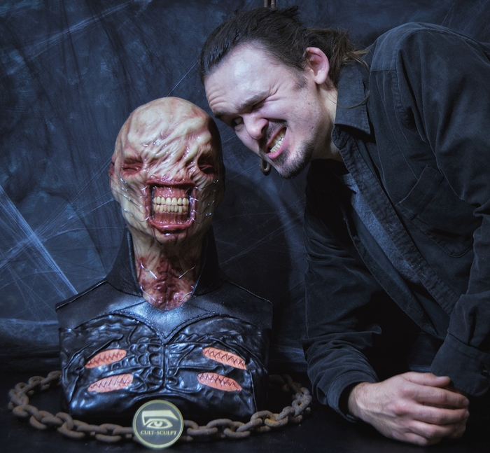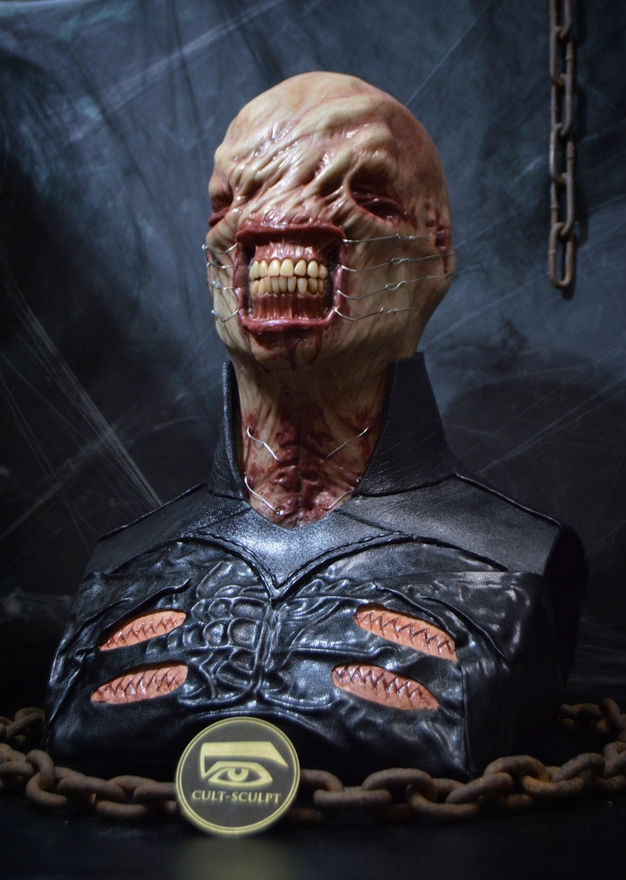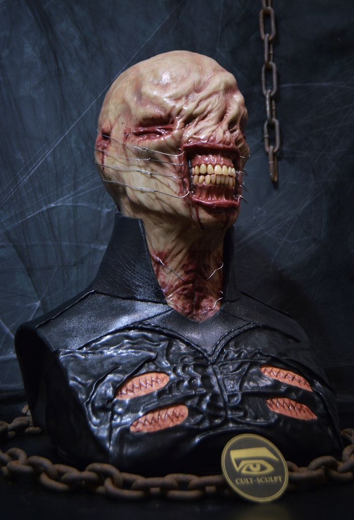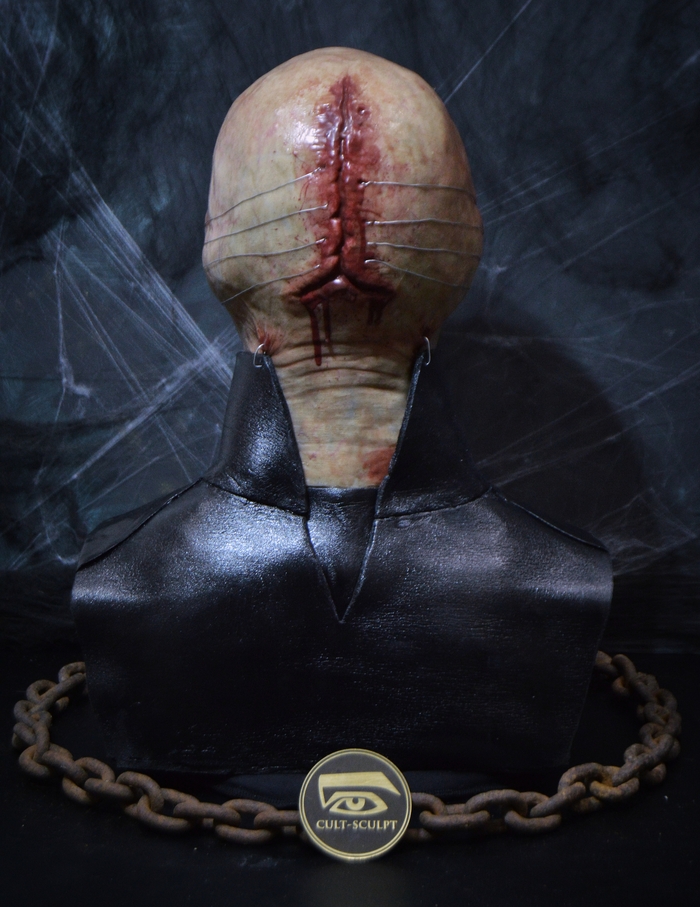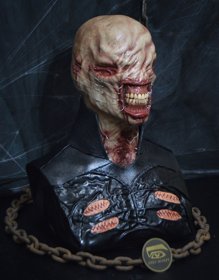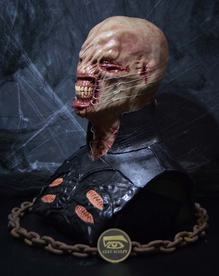 Всем привет! Сделал бюст в масштабе 1:1. Было интересно, увлекательно. Сенобит "щелкун", "болтун", "стучащий зубами" - персонаж из культового фильма "восставший из ада" в виде маски и бюста в натуральную величину. Маска сделана из силикона, основу бюста сделал из полиуретанового пластика и пены. Элементы одежды из искусственной кожи. Голову лепил из пластилина nsp medium. Фото процесса прилагаются