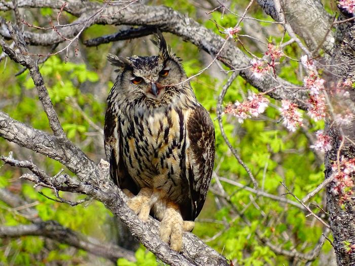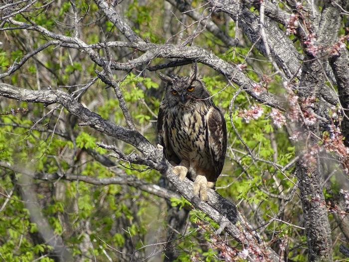 Это моя первая встреча с евроазиатским филином (самкой), которая произошла 08.05.16г., на потухшем вулкане "Сенькина шапка", расположенном возле с.Заречное Октябрьского района Приморского края. До этой встречи, я только слышал его голос, хотя тогда и не подозревал, что они принадлежат именно ему и внезапные его появления, что совершенно не позволяло мне ни сфотографировать, ни снять его на видео. Один раз, я спускался по каменным россыпям, шапки и так как я спускался медленно, потому что искал глазами змей, которые выползают на камни погреться, я вдруг на самом краю россыпи, в камнях, мне показалось, что на меня смотрят чьи-то глаза. Чтобы удостовериться в этом, а так же узнать, кто это за мной наблюдает, я остановился и стал медленно доставать фотоаппарат. И вдруг из того места, с шумом и криком, вылетает огромный птица. Я аж вздрогнул от неожиданности. Сосредоточась на ней, я пытался поймать её в объектив фотоаппарата, как вдруг, из того же места, с таким же шумом и криком, вылетает вторая птица. Тут уж мне было и не до фото и не до видео, а оставалось только наблюдать за полётом этих диких птиц, которых я здесь ни разу не видел. В дальнейшем, когда я приезжал сюда, то при восхождении, постоянно слышал крики из одного места, на шапке, которое находилось на самом обрыве, а однажды, когда я приблизился к нему, то на меня спикировала большая птица, которую я заметил в последний момент и даже пригнулся от неожиданности. Из-за неожиданности, я даже не смог распознать, что это за птица. Тогда я понял, что в том месте находится гнездо какой-то хищной птицы и когда я к нему приближаюсь, она меня предупреждает криками и пытается напугать или отвести от гнезда. И вот наконец-то настал тот момент, когда эта неизвестная для меня птица, решила показать себя во всей красе, когда в очередной раз отводила меня от гнезда. Это оказался красивый и грациозный евроазиатский филин, который специально садился так, чтобы и гнездо своё видеть и за мной следить. Вот так вот я и познакомился, с новым обитателем Сенькиной шапки, с которым уже встречался неоднократно.
