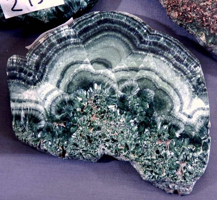 Дальше пара фото серафинита с выставки "Мир камня" в Санкт-Петербурге. Посмотрите, как меняется цветовосприятие камня в зависимости от освещения... При подсветке смартфоном на предыдущих фото-видео цвет более насыщенно-зеленый. А на фото с выставки, где много было естественного освещения - цвет заметно потускнел и стал сизо-серым.