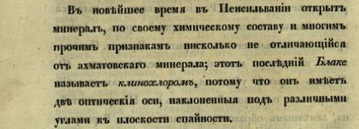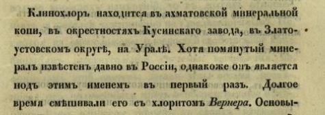 На самом деле, достаточно открыть те самые «Материалы к минералогии России», том I, стр. 368, где в главе ХХIII «Клинохлоръ» Николай Иванович черным по белому пишет, что описываемый им в этой главе минерал из Ахматовской копи, известен в России довольно давно. Но он назывался разными исследователями по-разному: Густавом Розе – хлоритом, Францем Кобеллем – рипидолитом… Из-за последовавшей путаницы, он предлагает взять название, данное Уильямом Блейком недавно выявленному в Пенсильвании очень схожему минералу – клинохлор и продолжать именно так подобные далее и называть…