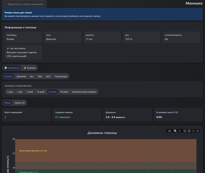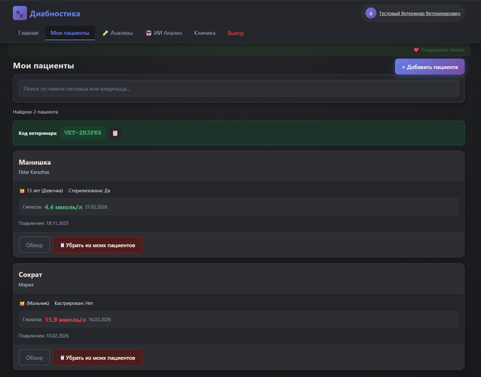 Отдельно хочу обратиться к ветеринарным врачам. В Diabnostic есть полноценный модуль для специалистов — можно подключаться к пациентам, видеть все измерения и анализы онлайн, отслеживать динамику без переписки в мессенджерах и пересылки фотографий бланков. Если работаете с хрониками — посмотрите, возможно это упростит вам жизнь.