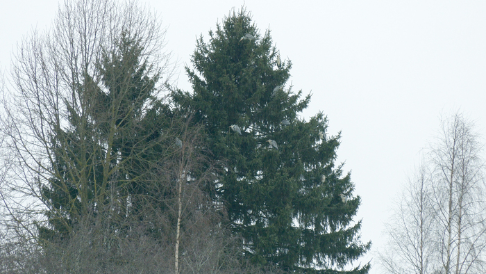 Серые цапли решили не улетать из Ленинградской области. Расселись на ели, словно игрушки, и ждут наступления Нового 2025 года