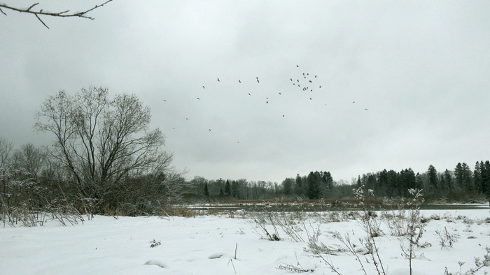 Большинство серых цапель зимой улетает от нас в Западную Европу или Африку, хотя некоторые птицы иногда остаются. Раньше в нашем регионе отмечались лишь единичные случаи, а в этом году на одном из озёр Ленинградской области успешно зимует более тридцати (!!!) птиц. Такое скопление серых цапель в одном месте наблюдается впервые. Вода здесь не замерзает: в этом месте в озеро впадает река с быстрым течением. Открытая вода позволяет цаплям успешно охотиться, и, судя по количеству птиц, еды здесь предостаточно.